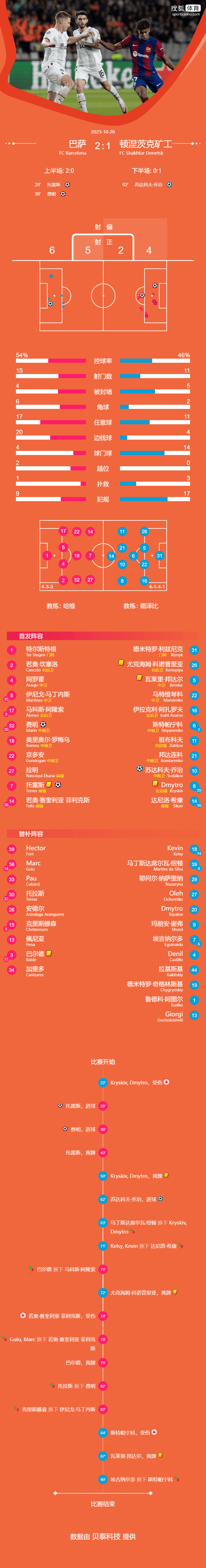 星空体育:北京时间10月26日,欧冠小组赛H组第三轮比赛拉开帷幕,巴塞罗那在主场迎战顿涅茨克矿工。在第28分钟,费兰-托雷斯在门前抢射得手,为巴萨打破僵局。第36分钟,费兰成功助攻小将费尔明,扩大了比分。然而,第62分钟,矿工的苏达科夫完成一记进球,将比分缩小。不幸的是,第74分钟,巴萨的菲利克斯受伤离场。最终,巴萨以2-1的比分战胜对手,赢得小组赛的第三场胜利,积累了9分,稳坐小组榜首。